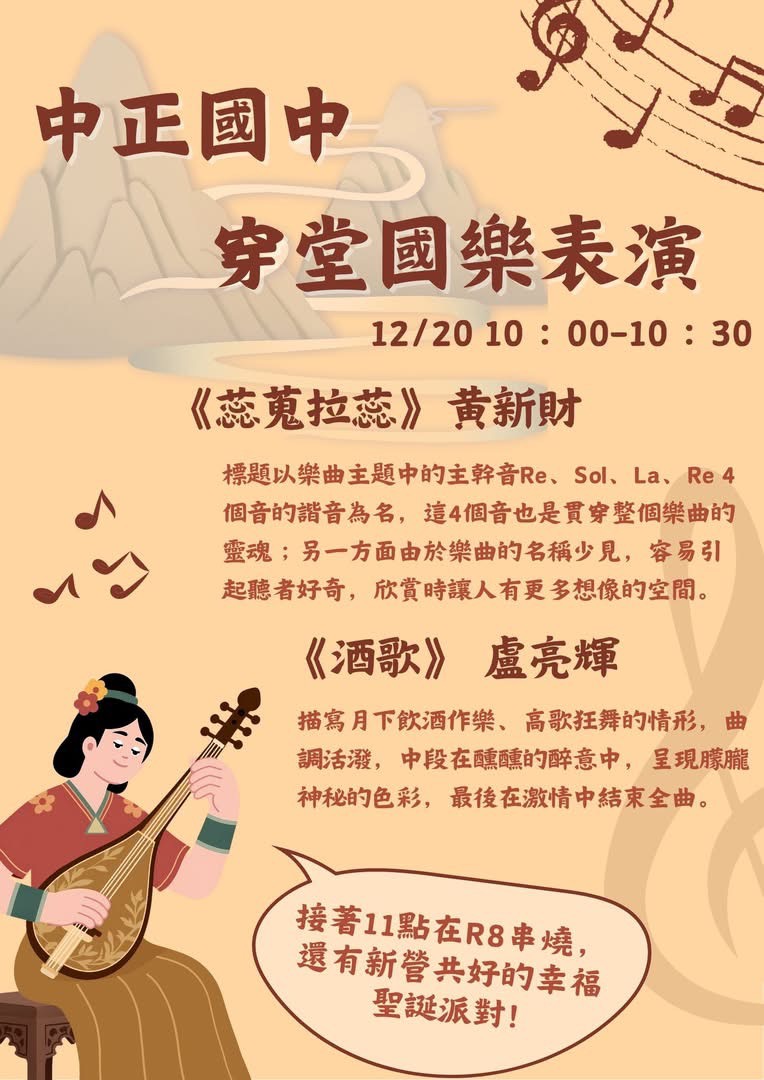 校園公告 公告主旨 新營里12/20(六)舉辦”新營共好,幸福聖誕派對”,本校國樂團參與音樂會表演,歡迎師生前往欣賞 發佈日期 2025 年 12 月 17 日 發佈單位 訓育組 公告類別 行政公告, 競賽與活動 公告等級 點閱次數 21 公告內容 相關附件 【2025-12-17】台北市立圖書館館辦理作家與讀者有約講座《未完的旅程》:一隻台 ... 【2025-12-17】賀!本校游泳隊參加114年第六屆XPORTS盃游泳分齡邀請賽榮獲佳績!