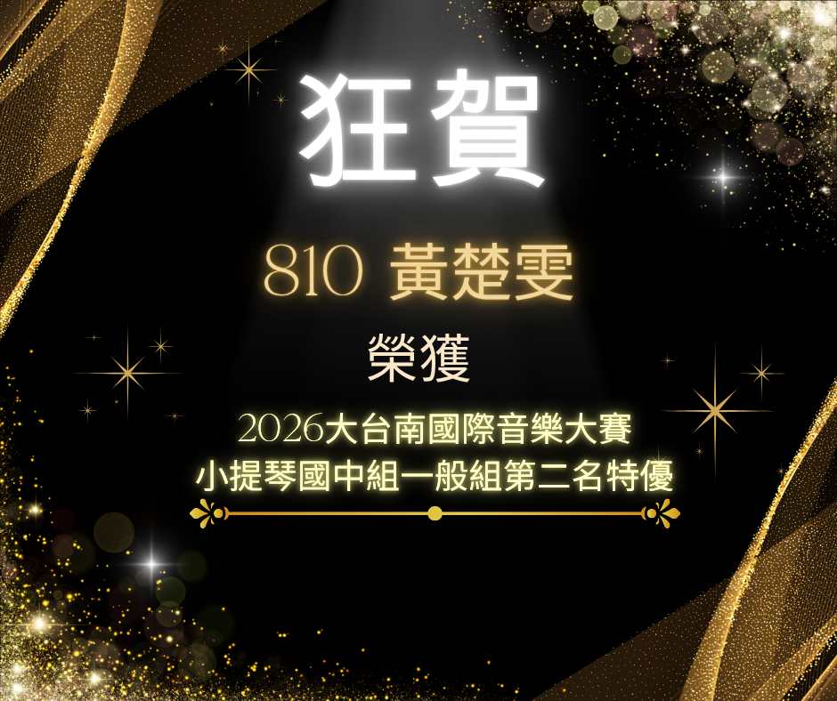校園公告 公告主旨 狂賀!本校810黃楚雯同學參加2026大台南國際音樂大賽榮獲小提琴國中組一般組第二名特優! 發佈日期 2026 年 4 月 20 日 發佈單位 訓育組 公告類別 榮譽榜 公告等級 狂賀 點閱次數 18 公告內容 相關附件 【2026-04-20】修正「臺北市政府所屬各機關學校教職員工酒後駕車經警察查獲及上 ... 【2026-04-20】輔導室辦理「百工職場半日微體驗:我是動物照護員!」參訪,歡迎 ...