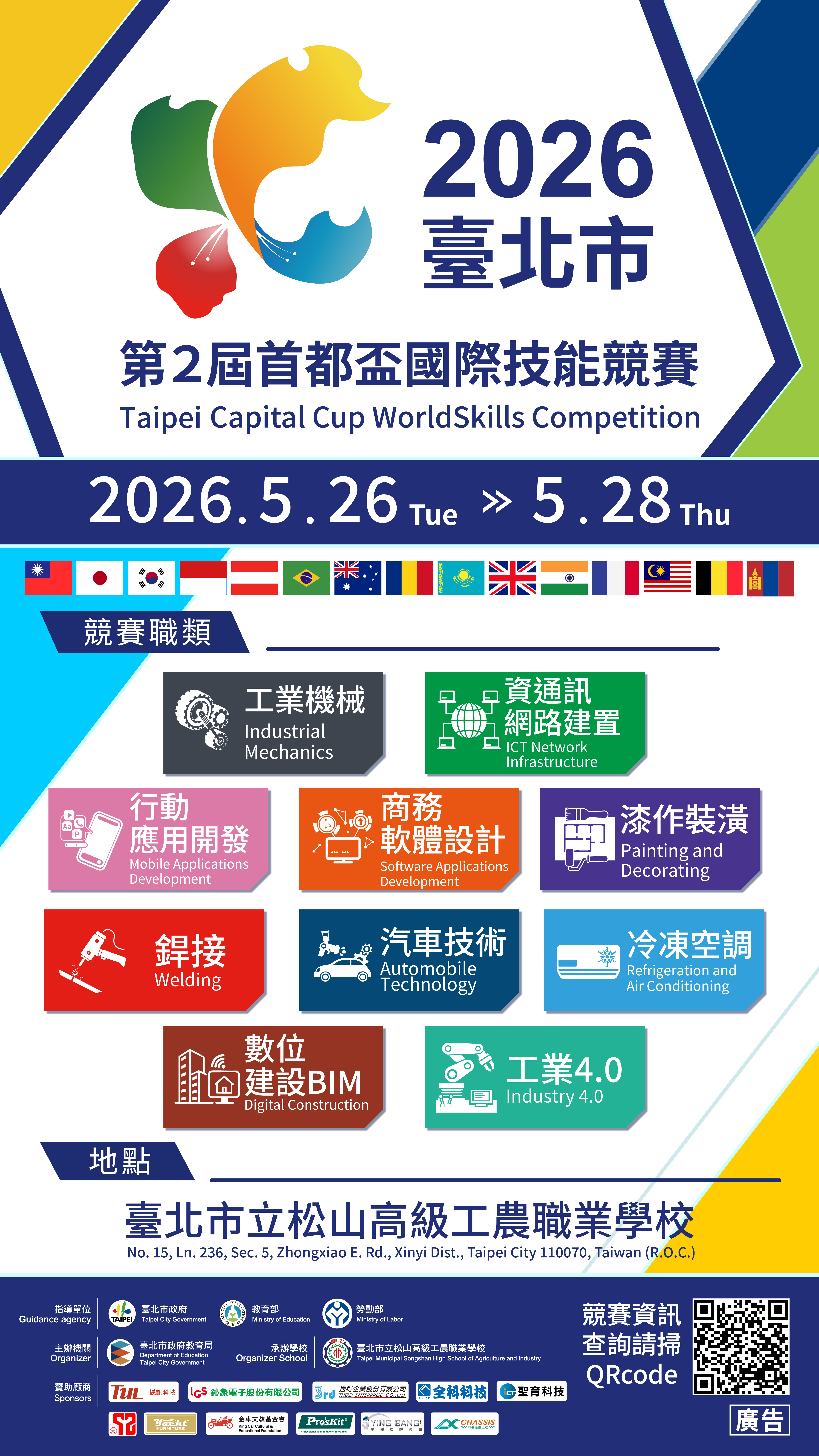 | 公告主旨 | 2026臺北市第2屆首都盃國際技能競賽「技職參訪活動」,歡迎有興趣的班級報名參加。 |